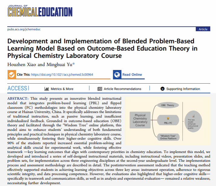 近日,suncitygroup太阳集团基础化学实验教学中心的重要教学研究成果“Development and Implementation of Blended Problem-Based Learning Model Based on Outcome-Based Education Theory in Physical Chemistry Laboratory Course”(J. Chem. Educ. 2026, DOI:10.1021/acs.jchemed.5c00964)在美国化学会旗下的《Journal of Chemical Education》(JCE)上发表。基础化学实验教学中心肖厚贞老师为论文第一作者,suncitygroup太阳集团为论文唯一通讯单位。