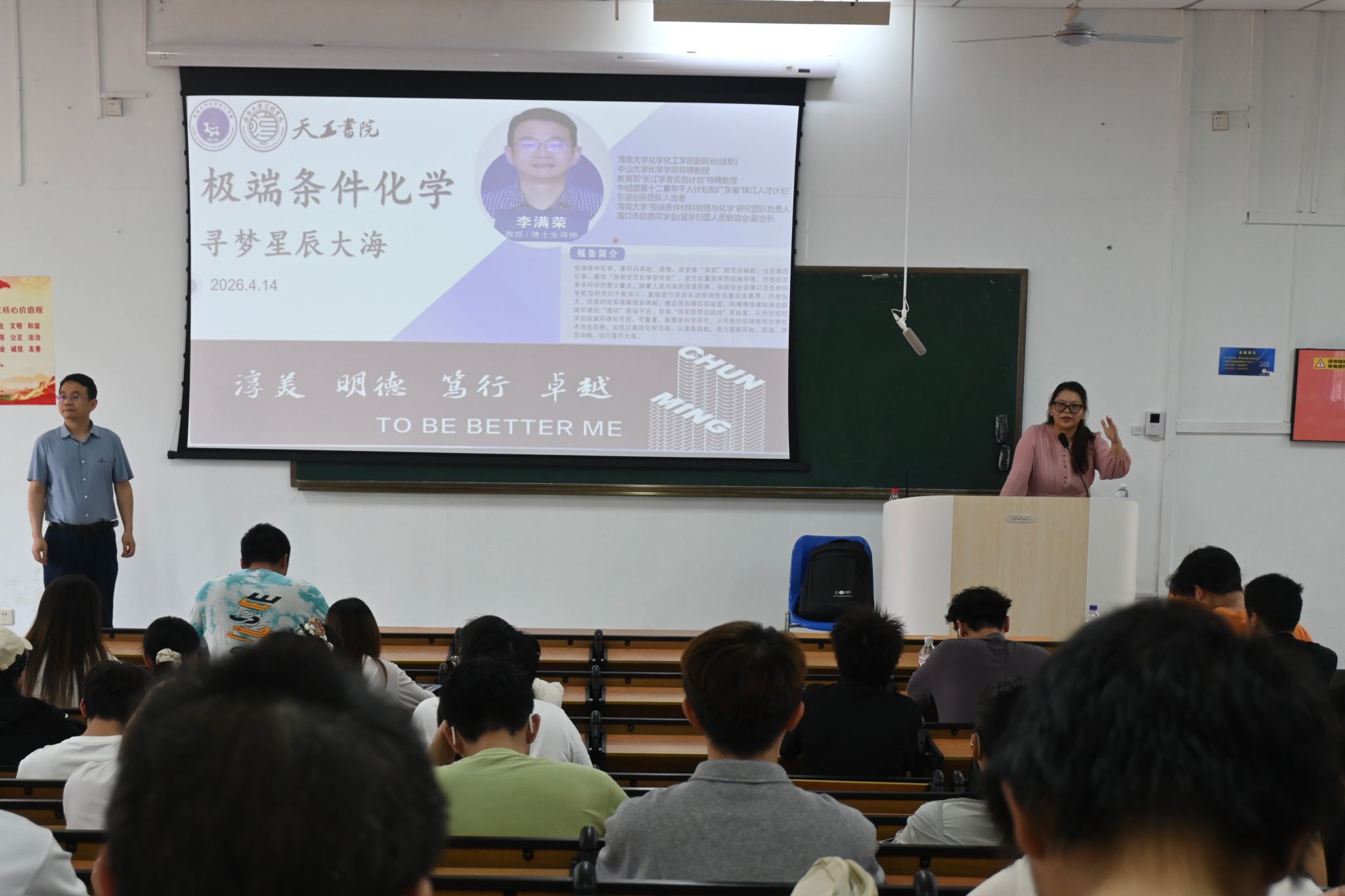 为充分发挥书院+学院协同育人机制优势,激发大一、二年级员工专业学习热情,2026年4月14日下午,由suncitygroup太阳集团、淳明书院、天工书院联合主办的“双院协同・名师导学”系列讲座首场在海甸校区第四教学楼201室成功举行。suncitygroup太阳集团副经理李满荣教授应邀作题为《极端条件化学-寻梦星辰大海》的前沿学术讲座。淳明书公司党委副书记武琼主持讲座,淳明书院辅导员钟涛、天工书院辅导员单佳馨与 200 余名公司大一、二年级员工共同参与。