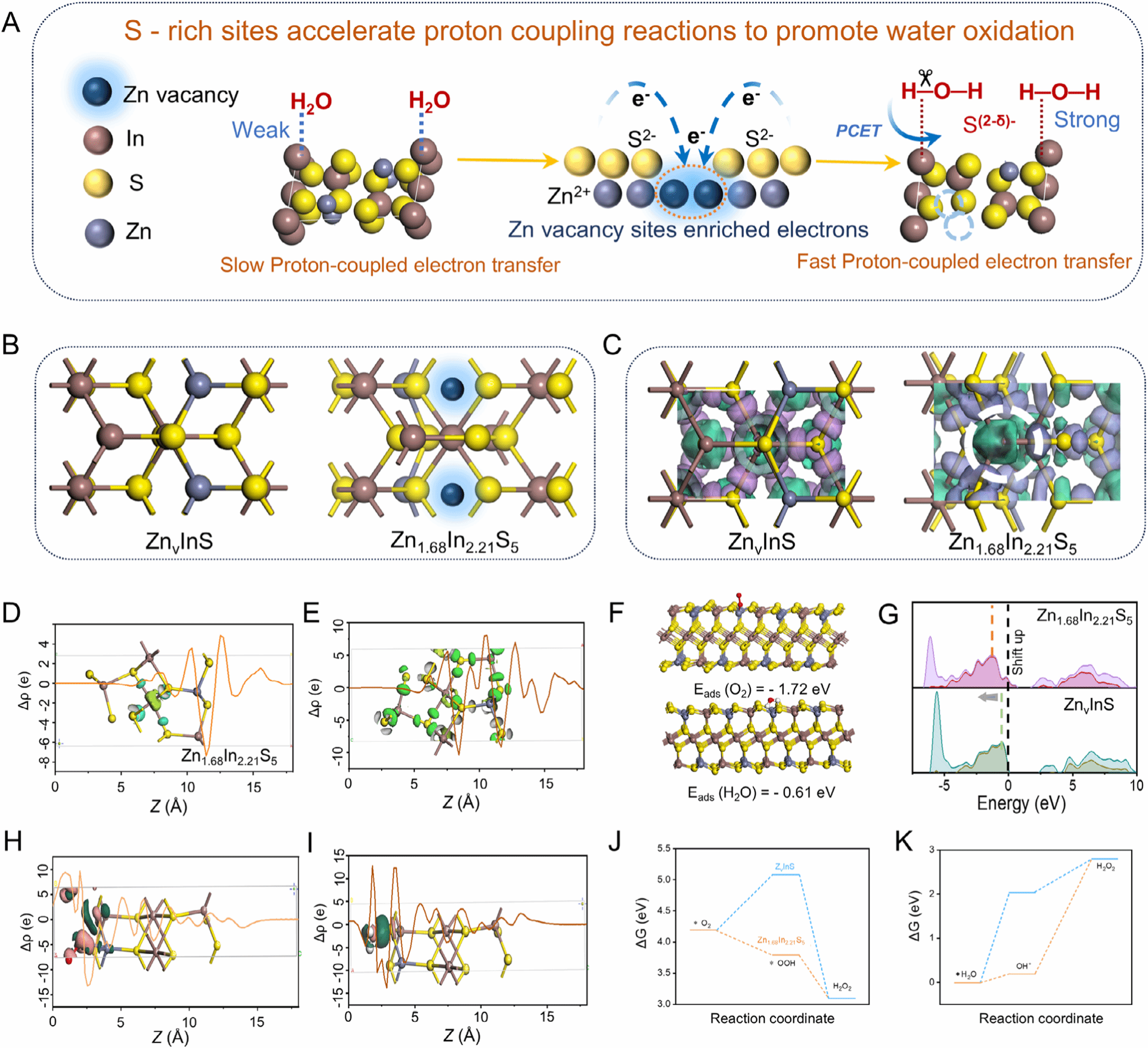 过氧化氢(H2O2)是一种绿色氧化剂,在医疗、环保和工业领域中具有广泛的应用。它的制备一般依赖于蒽醌法,但该法消耗能量大,而且对环境造成污染。光催化法是一种绿色制备H2O2的方法,在太阳光和催化剂的存在下直接将水和氧气转化为H2O2,但是该方法面临着还原速度缓慢、载流子复合快等的缺点。基于此,研究团队巧妙地将巯基引入到Zn1.68In2.21S5半导体催化剂上,保护了过渡金属硫化物中S位点容易自牺牲的特点,提升了催化剂的稳定性;机理是巯基硫上的孤对电子与催化剂上的Zn空位形成S 3p-Zn 3d轨道耦合,约束了巯基硫上的孤对电子,避免了电子-质子的复合(见下图);同时排空了巯基硫上的反键电子,即形成了电子缺陷活性中心,这强化了巯基硫与吸附态H的结合,提升了S-H对H2O的吸附能力,最终提高了制备H2O2的能力。