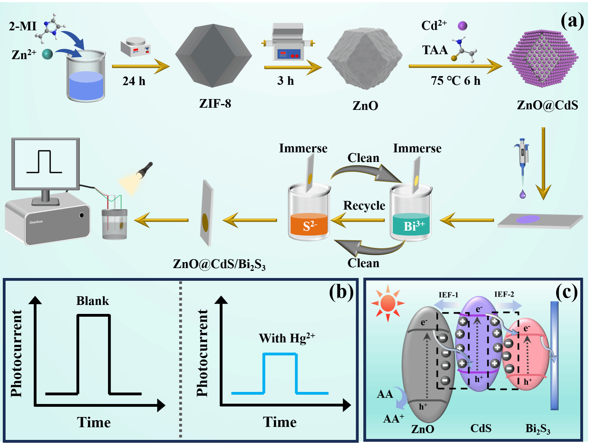 该研究针对现有光电化学传感器光电流强度不足、检测灵敏度受限的难题,创新性地设计并合成了ZnO@CdS/Bi₂S₃三元异质结材料。该三元异质结在ZnO/CdS和CdS/Bi₂S₃界面处形成了双内置电场,为光生载流子的定向迁移提供了强大驱动力。这些效应使所制备的传感器产生了远超单一及二元材料的“超强增强”光电流信号,为超高灵敏度检测奠定了物理基础。基于此材料构建的光电化学传感器对Hg⟡⁺展现出优异的检测性能,并在连续光照下表现出良好的稳定性。在湖水、海水、自来水、商业矿泉水及废水等多种实际水样的加标回收测试中,回收率在96.00% ~ 106.6%之间,证明了其在复杂环境基质中可靠的应用潜力。该研究不仅为环境中超痕量汞离子的监测提供了一种高性能的新方法,而且通过阐明双内置电场对电荷分离与迁移的增强机制,为设计下一代高性能光电化学传感材料提供了新的思路与理论依据。