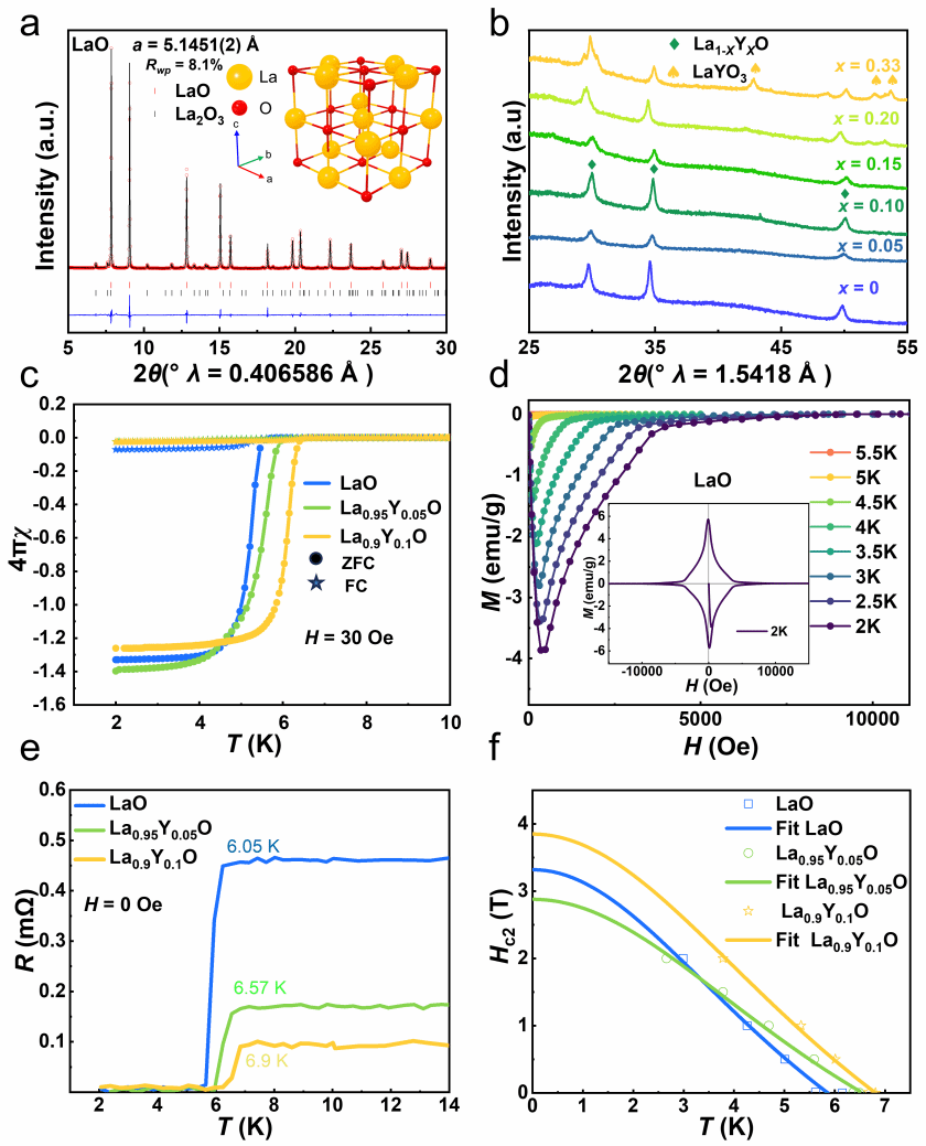 镧基化合物是超导研究的核心体系,但其中镧离子通常以+3价稳定存在,其5d电子态远离费米能级,不直接参与物理性质调控。然而在岩盐结构的单氧化镧(LaO)中,镧呈现罕见的+2价,使得5d电子进入巡游态,为探索基于5d轨道的新型量子现象提供了独特平台。长期以来,关于LaO的本征物态一直存在争议:早期研究认为块体LaO仅表现为金属性,而近年仅在拉伸应变的薄膜中观测到约5 K的超导电性,这引发了领域内对其超导电性是否本征、配对机制是否传统的深刻疑问。