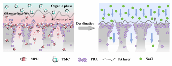 淡水短缺已成为制约全球可持续发展的关键挑战,海水淡化凭借其稳定供水能力在解决水资源危机中发挥着核心作用。反渗透技术因分离性能优异、能耗相对较低且工艺流程简洁,占据了全球约69%的已安装海水淡化产能,而通过界面聚合技术构建的聚酰胺薄层复合膜,更是被公认为反渗透脱盐领域的标杆材料。在此类膜中,聚酰胺分离层的交联度与厚度是决定膜截留和渗透性能的两个关键结构参数:分离层的高交联度赋予膜致密的网络结构,能够提升截留率;同时较薄的分离层则有助于缩短水分子和盐分的扩散路径,从而提升渗透性。针对上述挑战,该团队采用表面偏析策略,在基底制备过程中引入多巴胺作为表面偏析剂,将其与聚醚砜共混并通过非溶剂诱导相转化法制备基底。在基底形成过程中,多巴胺发生自聚合反应生成聚多巴胺,并凭借其亲水性自发向膜表面迁移与锚定,形成亲水多孔的表面结构。不仅显著改善了基底的亲水性,更在后续界面聚合的过程中通过氢键与π-π相互作用有效富集水相中的胺单体,同时减缓其向油相的扩散,从而实现对界面聚合反应的精准调控,成功制备出超薄且高交联度的聚酰胺分离层。