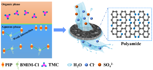 淡水资源短缺已成为全球可持续发展的关键挑战,其中一二价离子的分离,特别是氯离子与硫酸根分离已成为水净化领域的关键任务。纳滤技术凭借高效、低能耗的优势,成为实现离子选择性分离的核心技术之一。其中聚酰胺膜作为研究最为系统深入、技术最为成熟的种类之一,在水净化、物质分离等诸多领域展现出不可替代的广泛适用性与重要价值,已经成为商业化纳滤膜的主要材料。界面聚合作为制备聚酰胺层的核心技术,其过程本质上是水相单体与有机相单体在支撑体表面发生的缩聚反应。然而,在传统的界面聚合中存在胺单体快速、不受控制扩散的问题,往往倾向于形成致密且厚度不均的聚酰胺层,导致膜性能受限。针对上述挑战,研究团队创新性地将1-丁基-3-甲基咪唑氯盐(BMIM-Cl)作为水相添加剂,利用其与哌嗪之间的弱相互作用,适度降低PIP单体的扩散速率,从而实现对界面聚合过程的调控。